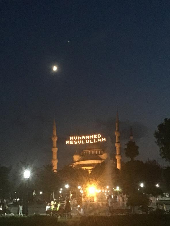 Напротив, там, где была Голубая мечеть, висел между минаретов протянутый светящий транспарант с хвалой пророку Мухаммеду (018).