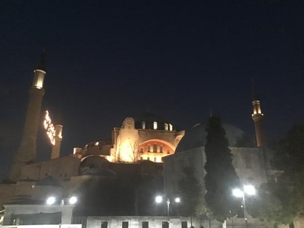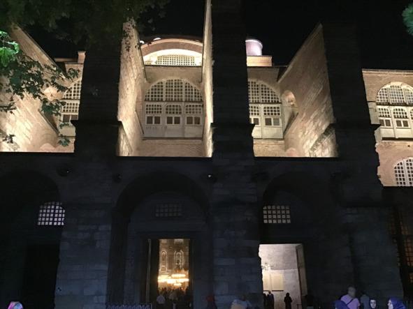 Трамвай продернул ко входу в парк, где были Айа-София и Голубая мечеть (019). Рысью помчался ко входу в Айя-Софию. Было уже темно, и на входе не было очереди, просто народ равномерно вливался в здание ровным ручейком. Нужно было проходить через металлодетектор. Он постоянно звенел, но охранники никого не стопили и не обыскивали. Видимо, такой порядок.