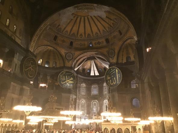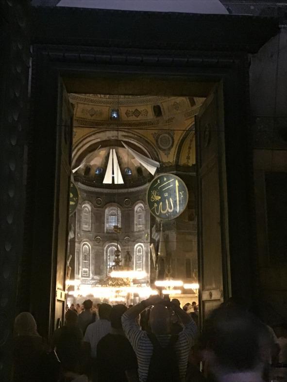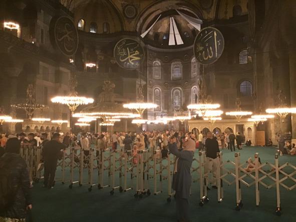 Одно из завоеваний ататюркской революции в новой Турции было превращение Айа-Софии из действующей мечети в музей — по приказу самого Ататюрка (его убедил в этом какой-то авантюрист-англичанин). Эрдоган это дело повернул назад, и возвратил Софии статус действующей мечети. Поэтому в начале зала была перегородка (022) — для отделения туристов от верующих. Такое тут практически во всех исторических мечетях. При входе висит табличка — пожалуйста, не проходите и не мешайте верующим во время намаза. На это смотрят сквозь пальцы.