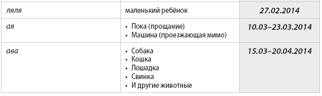 Эта таблица заимствована из внешнего источника и приводится здесь не для жёсткой оценки ребёнка и уровня его развития, а лишь чтобы дать возможность приблизительно ориентироваться в сроках и последовательности развития форм речи, что может быть особенно полезно для молодых родителей и начинающих педагогов. В реальной жизненной ситуации эти параметры могут значительно варьировать в зависимости от социальной и психологической ситуации развития ребёнка, его индивидуальных особенностей, пола и других факторов. Тем не менее, если даже при благоприятных условиях развития в определённые возрастные периоды указанные формы речи у ребёнка не появляются, это должно насторожить близких.