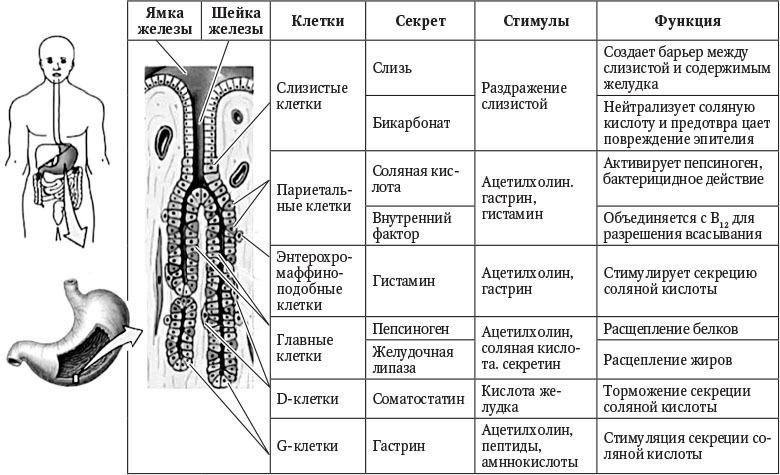 Синтез и секрецию HCl в париетальных клетках стимулируют ацетилхолин, гастрин и гистамин, которые активируют свои специфические рецепторы (М3, G и Н2) на мембране клеток и непосредственно на тубуловезикулах, содержащих Н+/К+-АТФазы. Ингибируют синтез и секрецию HCl простагландины и соматостатин. Несмотря на постоянное функционирование нескольких путей и уровней регуляции, секреция HCl четко интегрируется в соответствии с необходимыми для оптимального пищеварения уровнями кислотности, который определяют хеморецепторы желудка и который зависит 1) от состава пищи и 2) от способности желез желудка к ощелачиванию.