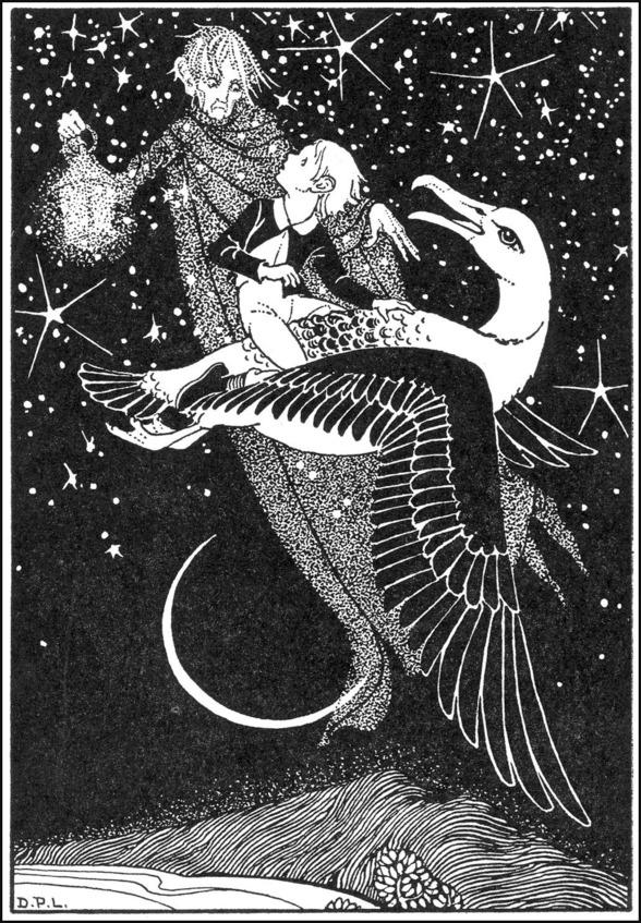 Джек подумал, что охотно займется долгим устным счетом, чем будет вынужден свистеть. Но он не мог сделать этого, когда феи говорили с ним; он почувствовал, что кто-то снова держит его за ноги, а потом толчком подсадил его себе на спину, где Джек сидел верхом, и удивлялся, пони ли это. Но это не был пони, а Джек тотчас заметил, что существо имело узкую шею и было покрыто опереньем. Это была большая птица, и мальчик сразу обнаружил, что они поднимаются к отверстию, которое находится очень высоко. В несколько минут птица промчалась через отверстие с Джеком на своей спине и со всеми феями в его карманах.