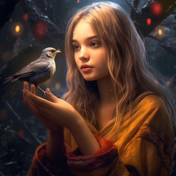 Suddenly, she saw a flash of bright color out of the corner of her eye. She turned to see a small bird with feathers that sparkled like diamonds. “Hello there,” Alice said, holding out her hand. The bird hopped onto her palm and chirped happily.
