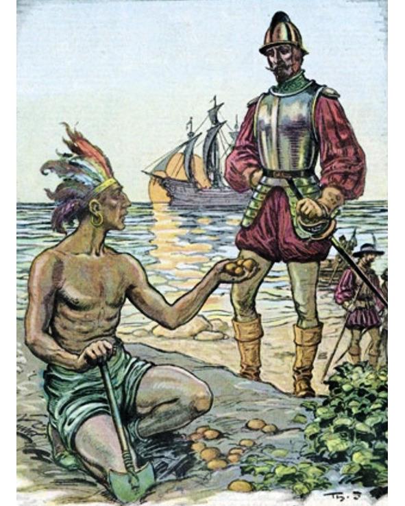 Однако широкую известность в Европе картофель получил не благодаря письму конкистадора Педро де Вальдивия к королю, а благодаря книге испанца Педро Чьеза де Леона — «Хроника Перу». Больше четырехсот лет назад тринадцатилетний мальчик Педро Чьеза де Леон пробрался тайком на корабль испанских конкистадоров, первых завоевателей Южной Америки, и вместе с ними очутился в изумительной для европейца стране Перу. Испанской короне требовалось золото и серебро. И испанские конкистадоры искали эти «благородные» металлы, беспощадно грабя удивительную страну. Они убивали перуанцев, жестоко их пытали их железом и огнём, требуя отдать всё золото и серебро, сжигали их дома и целые селения.