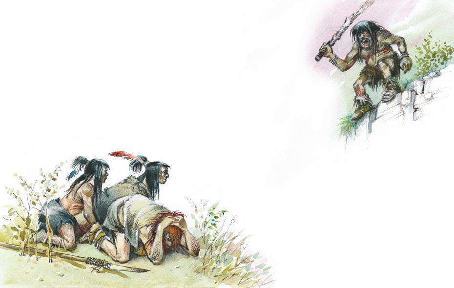 Охотники отпрянули прочь и быстро сбежали вниз, на песчаную террасу. Зубы их стучали от страха. Куолу нагнулся, поднял с земли камень и швырнул с высоты в охотников. Волчья Ноздря бросился ничком на песок и обеими ладонями закрыл голову. Ао и Улла сделали то же. Так лежали они неподвижно, откинув в сторону оружие и уткнувшись лицом в землю.