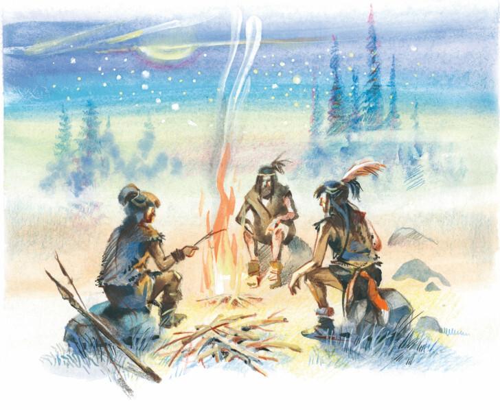 За едой и разговорами незаметно спустился сумрак. Вверху зажигались звёзды. Лагерь начал готовиться к ночлегу. На всякий случай зажгли костры. Люди расположились на земле, и огонь охранял их сон от зверей и от злых взглядов, которые приносит ветер.