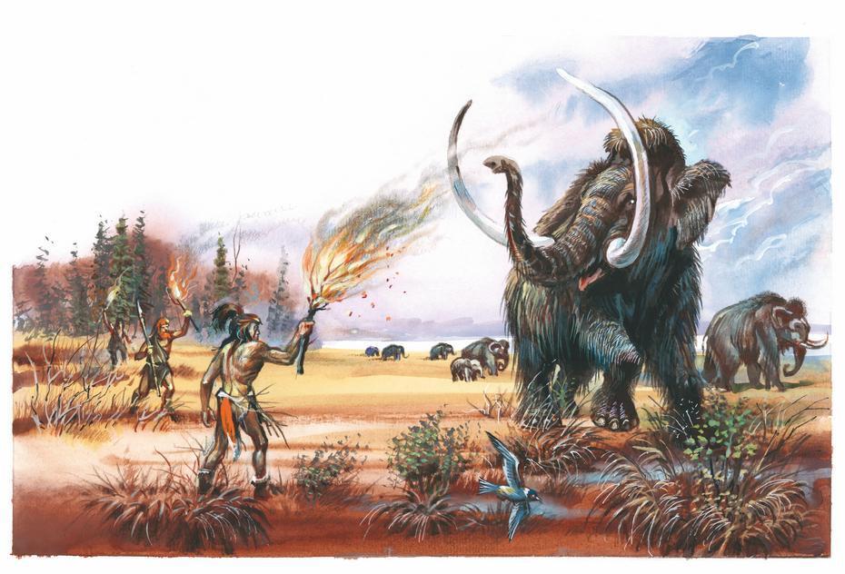 Мамонты всё ещё продолжали неторопливо набивать пищей свои необъятные желудки. Лесная поляна, богатая кормами, была для них настоящим раздольем. Густая трава, пестреющая весенними цветами, сочные лозы ивняка и жимолости, вяжущие язык, ветки молодых осинок и берёз – всё это было для них лакомым блюдом. Взрослые хуммы держались ближе к опушке, и можно было видеть, как они с треском ломали древесные сучья. Их чудовищные коренные зубы, тяжёлые, как жернова, растирали не только траву и листья, но и крепкую кору и древесину. Мамонты так были заняты едой, что, казалось, ни на что не обращали внимания. Вдруг один из вожаков тревожно насторожил уши. Как два огромных кожаных лоскута, они поднялись и оттопырились по сторонам головы. Хобот вытянулся вперёд, хумма шумно вдохнул в себя свежую струю холодеющего воздуха.