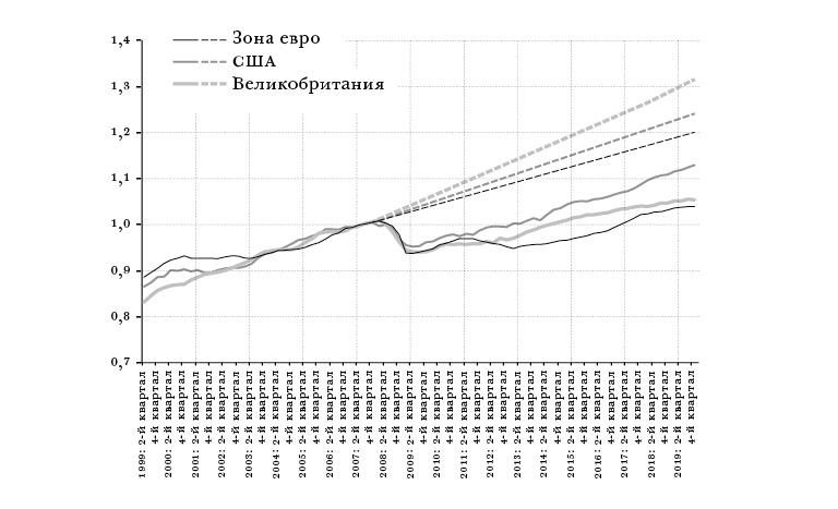 На рис. 1 показано, каким был бы среднедушевой выпуск, если бы экономический рост продолжал следовать тенденции, наблюдавшейся от начала столетия до финансового кризиса: развитые страны были бы на 20–30% богаче.