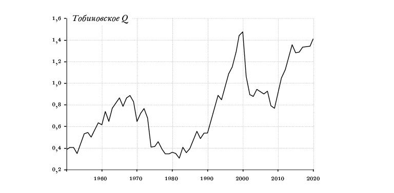 Но проблема с экономическим ростом не только в том, что он замедлился: указанное замедление открыто противоречит многим стандартным экономическим объяснениям. Слабый рост начала XXI века сосуществует с низкими процентными ставками и — до ковидного кризиса — с высокими оценками стоимости компаний. Экономисты называют это явление долгосрочной стагнацией (secular stagnation). Мы видим эти высокие оценки на рисунке 1.2. Тобиновское Q [20] (показатель того, сколь оптимистично инвесторы смотрят на будущие прибыли компаний), хотя и не достигло ошеломляющих высот времен «бума доткомов» [21], куда выше минимумов 1980-х годов.