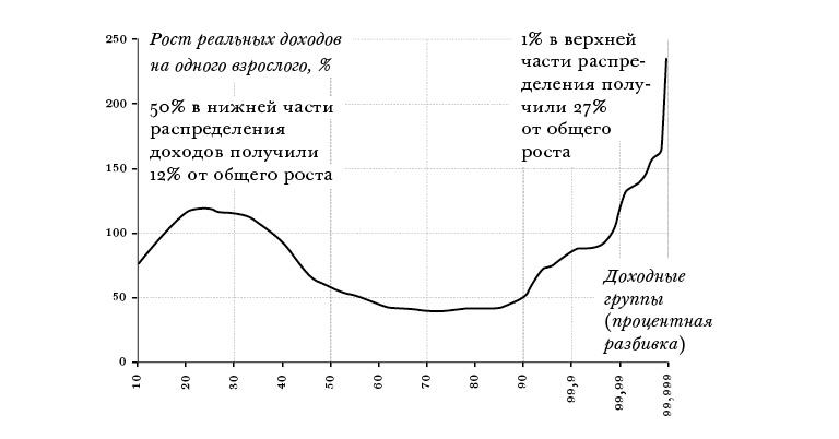 Рис. 1.3. Рост доходов в отдельных доходных группах по миру в целом, 1980–2016 годы