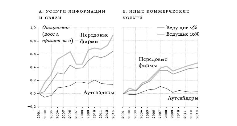 Примечание: на графиках А и Б группа всемирно передовых фирм определяется как 5% компаний с наивысшей совокупной факторной производительностью внутри каждой укрупненной (two-digit) отрасли, а все остальные фирмы рассматриваются как аутсайдеры.