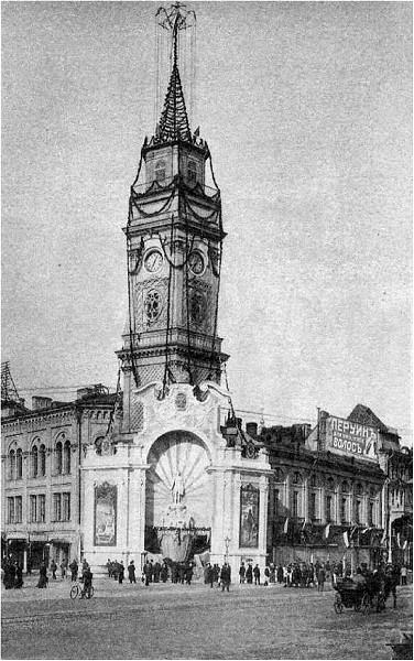 Некоторые дома украсились художественно. Всероссийски известный пройдоха — Генрих Блок весь футляр, закрывающий новостроющийся дом его[14], завесил гигантским полотном с цифрою 200 среди нарисованных цветных гирлянд. Дурацкие шесты обвили ельником; на панели против Гостиного двора устроен сквозной зеленый трельяж, тоже перевитый ельником. Это место — лучшее в Петербурге. Против средних ворот устроен дикий уголок первобытной Невы: скалы, ели, и среди них с топором в руке стоит Петр, как бы озирая простор перед собой. Задумана декорация и выполнена художественно. Несколько наискосок, со стен Пассажа, выдвигается нос оснащенного белого корабля с надписью «Россия»; на нем опять Петр. Дума украшена безвкусно: перед какой-то размазанной по полотну яичницей, долженствующей изображать лучи восходящего солнца, вычурно и напыщенно стоит Петр, опираясь на трость; боковые картины тоже аховые, не выше работ домовых маляров; одна представляет иллюстрацию к стихотворению о починке Петром разбитой ядрами лодки рыбака; Петру сделали такую физиономию, точно он не лодку чинил, а стрельцов рубил!
