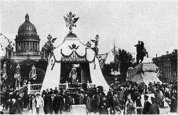 16 мая. Утро чудесное! Пошел по Невскому пр. пешком к собору Исаакия. Пестреют флаги и драпировки, магазины закрыты. Против Невского у Николаевского вокзала стоит арка с тремя картинами: средняя изображает бурю на море и Петра, спасающего тонущих; левая — вид Петербурга, правая — вид Невы до основания города. Народ лился по обеим сторонам густой и спокойной волной; много было простонародья, все приодеты, чистенькие, трезвые: винные лавки были закрыты еще накануне.