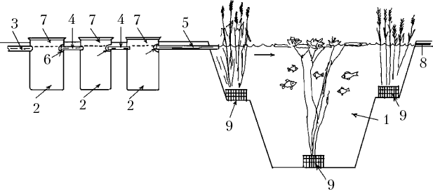 Схема соединения второй очереди отстойников с прудом: 1 – ставок; 2 – отстойник; 3 – трубопровод для отвода воды от отстойника под водосточной трубой к отстойникам второй очереди; 4 – трубопровод, соединяющий отстойники; 5 – трубопровод, который соединяет последний отстойник с прудом; 6 – сетка-фильтр; 7 – крышка; 8 – трубопровод для отвода излишков воды; 9 – контейнер для водных растений