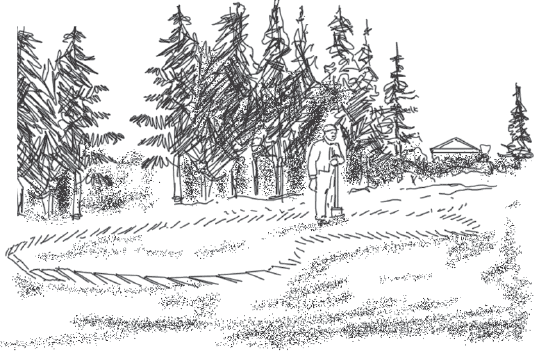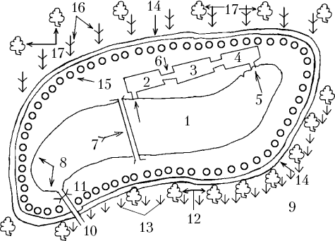 Вариант расположения искусственного водоема на приусадебном (дачном) участке с родниковым водоснабжением: 1 – искусственный водоем; 2 – дафниевая яма глубиной 0,6 м; 3 – дафниевая яма глубиной 0,45 м; 4 – дафниевая яма глубиной 0,3 м; 5 – соединительные каналы между дафниевыми ямами и искусственным водоемом; 6 – соединительные каналы между дафниевыми ямами; 7 – мостик через искусственный водоем; 8 – подводная растительность; 9 – река (озеро); 10 – соединительный канал (труба) между искусственным водоемом и рекой (озером); 11 – решетка в канале, которая препятствует выходу рыбы из искусственного водоема; 12 – березовые насаждения; 13 – насаждение из лозы; 14 – защитный бруствер (земляной вал), предотвращающий попадание к водоему вредных веществ во время дождя или наводнения; 15 – цветник; 16 – плодово-ягодные кустарники; 17 – фруктовые деревья