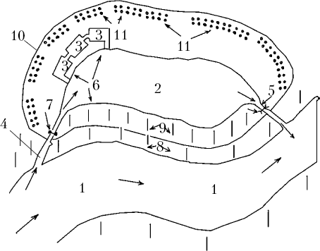 Водоем с речным водоснабжением: 1 – река; 2 – искусственный пруд; 3 – дафниевые ямы; 4 – соединительный канал, который обеспечивает поступление воды; 5 – соединительный канал, который обеспечивает отток воды; 6 – надводная и подводная растительность; 7 – рамка с сеткой, которая препятствует выходу рыбы; 8 – прибрежные лесонасаждения; 9 – березовые насаждения вдоль водоема; 10 – защитный земляной вал; 11 – цветник