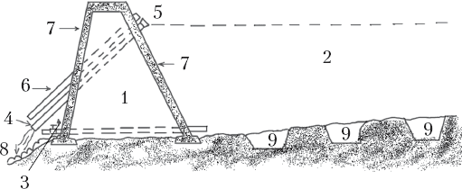 Устройство водослива в водоеме при слабом ручьевом водоснабжении: 1 – насыпная дамба; 2 – пруд; 3 – сливная труба с краном; 4 – переливная труба; 5 – сетка на переливной трубе; 6 – резервная переливная труба (переливные трубы можно установить горизонтально или под углом); 7 – забетонированная часть дамбы; 8 – булыжная отмостка, которая препятствует размыванию грунта; 9 – ямы для вылавливания рыбы при полном освобождении пруда от воды