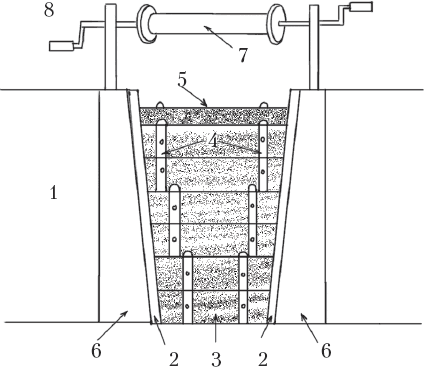 Щитовой водослив в водоемах с эффективным ручьевым водоснабжением: 1 – дамба; 2 – направляющие полозья для подпорных щитов; 3 – водоподпорные щиты; 4 – металлические пластины с петлями для крепления; 5 – каркас с сеткой, которая предотвращает выход рыбы; 6 – бетонная основа водослива; 7 – съемный барабан для поднятия водоподпорных щитов; 8 – пруд