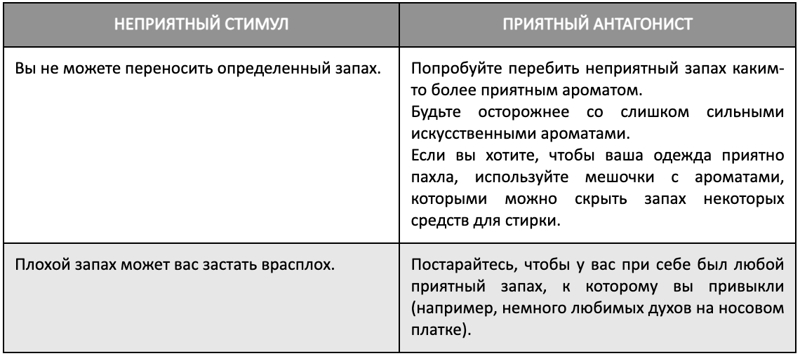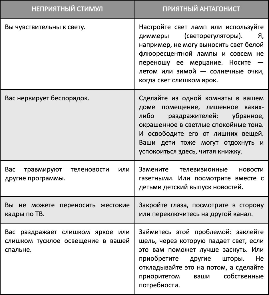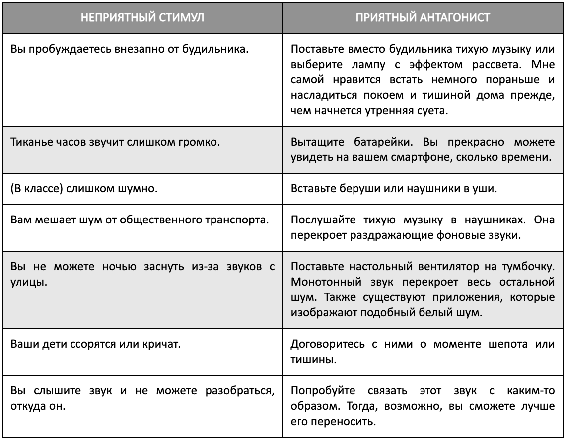У всех стимулов органов чувств существует как приятная, так и неприятная версия. Если вы находитесь в расслабленном состоянии, то можете хорошо переносить любую из них. Однако если вы в стрессе или устали, то воспринимаете неприятные стимулы сильнее и переносите их намного хуже. Как с этим бороться? Есть простой способ: попытайтесь чем-то заменить источник неприятного стимула. Вам мешает какой-то звук? Включите красивую музыку! Чешется кожа под свитером? Наденьте другой! Раздражает какой-то запах? Проветрите помещение! Поверьте: даже небольшое изменение позволит вам чувствовать себя лучше.