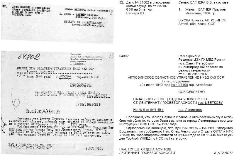 В подписанном им приказе говорилось: «Вагнер Павлина Ивановна проживала совместно с осужденным (имеется в виду Вольдемар. – А. М.) со дня замужества (1922 г.) до дня ареста мужа, была на полном иждивении последнего, после ареста мужа помогает ему материально и поддерживает с ним постоянную переписку, а поэтому ея проживание в окрестностях Ленинграда, в частности в г. Слуцке является социально опасным и невозможным». В графе «выслать» карандашом от руки было вписано место ссылки: «г Актюбинск Актюбинской области Казахской ССР». На сборы семье дали пять дней. Так, без суда и следствия, без приговора по какой-либо статье – только за то, что моя прабабушка жила со своим мужем и поддерживала с ним связь после ареста, она вместе с тремя детьми была лишена всего и выслана в Казахстан.