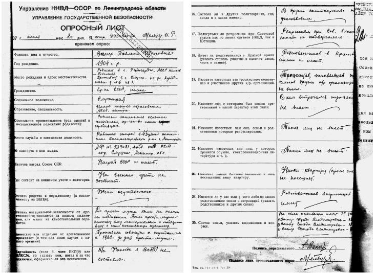 Первые документы в деле – справки. Сначала о Вольдемаре: где, когда и за что осужден, – и о том, что Паулина его жена. Потом о Паулине: где живет, где работает. Опросный лист, анкета Паулины, составленная НКВД. Подписка о невыезде из Слуцка (так в то время назывался Павловск). Приказ, подписанный 22 июля 1937 года заместителем начальника УНКВД по Ленинградской области М.Я. Состе.