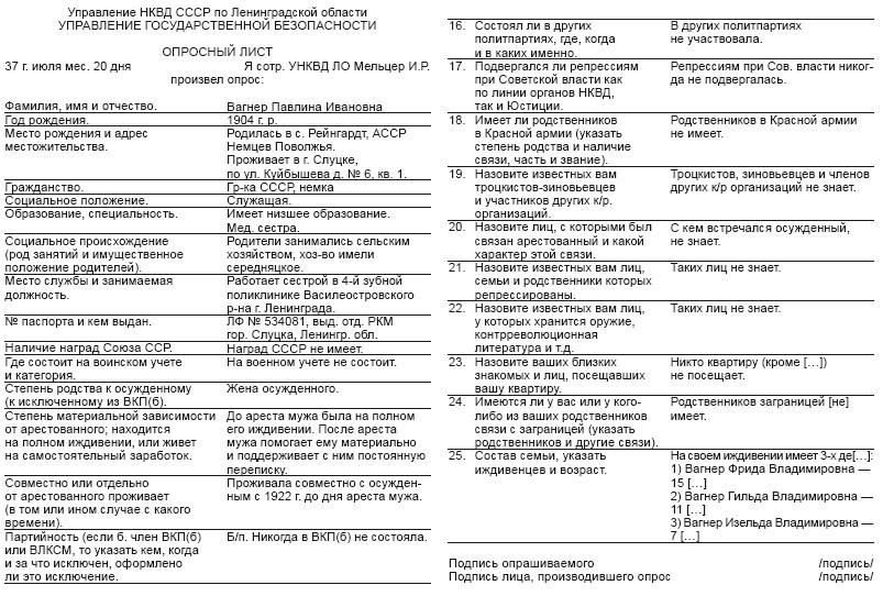В этом странном состоянии я шел по Литейному из УФСБ в ГУ МВД – там мне предстояло знакомиться с делом жены Вольдемара, моей прабабушки Паулины Иоганновны Вагнер, в девичестве носившей фамилию Арнст (на русский манер ее звали Полиной Ивановной). В отличие от дела Вольдемара, которое было уголовным, дело Паулины было административным – поэтому хранилось в МВД (стр. 34–41). В региональных архивах управлений Министерства внутренних дел лежат дела тех, кто подвергался административным репрессиям: раскулачиванию, выселению по национальному признаку или по причине неблагонадежности, как это было в случае с Паулиной.