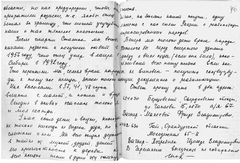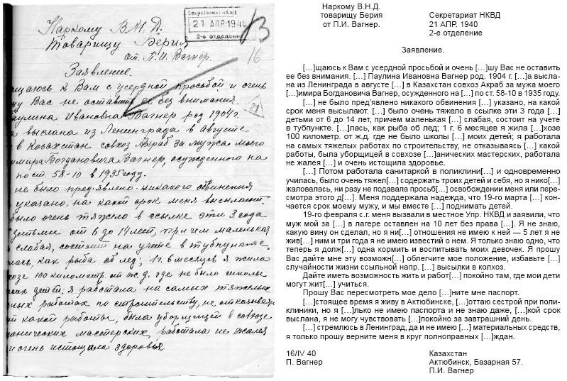 Паулина адресовала письма Берии[9], просила выпустить мужа пораньше, чтобы он успел приехать до навигации, так как ей очень тяжело одной растить троих детей (стр. 55). Повзрослевшие дочери тоже писали в НКВД, надеясь вернуть мать из Аральска на их обеспечение. Позже они же просили рассказать о том, в чем состояла вина отца, так как они до сих пор чувствуют на себе печать «дочерей врага народа». Эти письма – простые, искренние и наивные – невозможно читать без слез. Все они были аккуратно подшиты к делу.