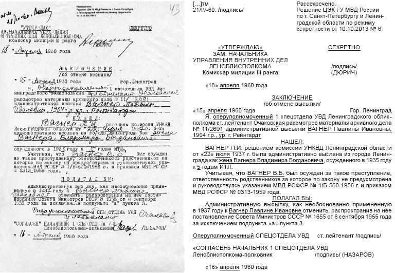 Паулина пробыла в ссылке восемнадцать долгих лет. Интересно, что в «Заключении об отмене высылки», подписанном в 1960 году, уже после официального снятия Паулины с учета, есть такой абзац: «Учитывая, что Вагнер В.Б. был осужден за такое преступление, ответственность родственников за которое по закону не предусмотрена […] полагал бы административную высылку, как необоснованно примененную в 1937 году […] отменить». То есть не было никаких законных оснований для высылки Паулины с детьми – но она состоялась, и все ходатайства регулярно отклонялись. Кривая логика социалистической законности.