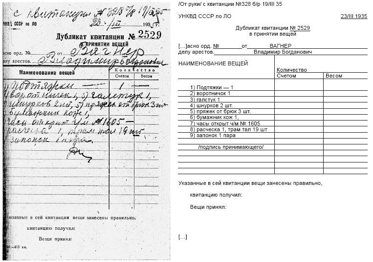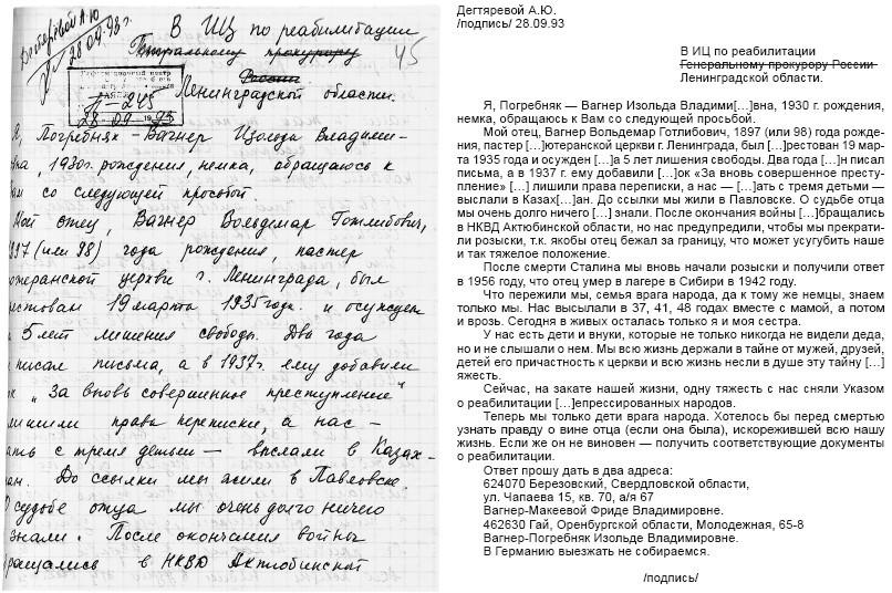 Через месяц в моем почтовом ящике лежало письмо. На штампе стоял адрес: Санкт-Петербург, Информационный центр ГУ МВД. Я перечитывал это письмо несколько раз, но никак не мог ухватить суть. Непонятен был даже язык: странные формулировки, очень длинные предложения с большим количеством сложных оборотов, цитат из законов и регламентов. Сейчас я и сам пользуюсь таким языком для написания запросов, но тогда это было в новинку. Ваш запрос, говорилось в письме, «в части, касающейся ознакомления с архивным делом в отношении Вагнера Вольдемара Богдановича» отправлен в УФСБ России по Санкт-Петербургу и Ленинградской области – и оттуда «вам будет дан ответ». Я понятия не имел, почему письмо переслали, мне даже в голову не приходило, что ФСБ и МВД имеют разные архивы и хранят дела по разным категориям репрессий.