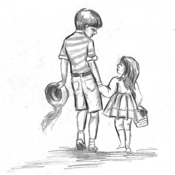 Солнце стояло в зените, когда две кудрявые головки показались из-за кустов, поднимаясь от речки прямо в гору по каменистому обрыву. Это были Ванюша и Валечка. Семилетний Иван крепко держал за руку пятилетнюю Валечку, а она другой ручкой, приподняв подол платья, несла кучу разноцветных камней, которые они насобирали с Ванюшей. Солнце лучами игриво гладило две кучерявые головки, наделяя их светом и теплом текущего дня.