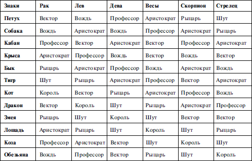 Все остальные персонажи получаются аналогичным путем. Рыцарь – с помощью сдвига на два шага (в обе стороны), Аристократ – сдвигом на три и шесть, Профессор – сдвигом на четыре, Вождь – сдвигом на пять. Все это достаточно сложно, а потому лучше обратиться к таблице, по которой найти свой знак в виртуальном гороскопе очень легко (см. таблицу на стр. 7).