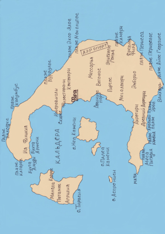 От цельного круглого острова остались лишь осколки — современные острова Тира, Тирасия и крошечный Аспро (Аспрониси). Истерзанные остатки суши покрыли вулканические породы. Древний город Акротири, как века спустя Помпеи, оказался на тысячелетия погребен под тоннами пыли и пепла. Археологи впоследствии сделали вывод, что жители минойского поселения, процветавшего на острове до катастрофы, смогли покинуть остров до начала извержения. Предупреждением им послужили землетрясения, сотрясавшие остров до взрыва. Успели люди укрыться в безопасном месте или погибли в море — не известно.