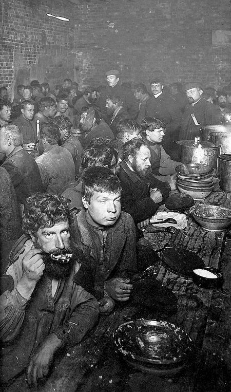Все 40 номеров бойни делятся на три отделения: первое назначено для быков, второе – для телят и третье – для свиней и поросят. Летом происходит усиленная деятельность, и все номера бывают заняты. Работать начинают рано утром, часов в шесть, зимою при огне. Около быка вертится на бойне до 200 рабочих. Одних неутомимых «удалых бойцов» насчитывается до 150 человек. Бойцы организовались в три артели: для быков, телят и свиней. Каждая артель выбирает себе старосту, которому и подчиняются все члены артели. Артель пользуется от бойни даровым помещением, где живут сообща: кровати расставлены рядами, стол имеют общий. Любопытно, что бойцы, эти бичи быков, соблюдают посты самым строжайшим образом. При бойне имеется особая комната, где хранятся орудия боя: кинжалы, ножи, топоры, тут же на крючьях развешены кожаные рубашки, ножны, напилки, точилки и т. п. Отправляясь на работу, бойцы надевают кожаные рубашки, высокие голенища сапог подвязывают ремнями, рукава засучивают по локоть и затем опоясываются широким кожаным ремнем, к которому привешивается кинжал в особых деревянных ножнах. Староста артели – это рыжебородый, широкоплечий, крепкого телосложения мужчина, бывший лихой боец на Гутуевских скотобойнях8. Смотря на его расторопность, энергию и небольшие хитрые глаза, вы невольно подумаете: ну, брат, недаром тебя выбрали старостой. Сорок лет тому назад приехав из деревни, он пристроился на бывших Гутуевских скотобойнях; поработав над быками лет тридцать, он наконец удостоился быть избранным в старосты. Заметно было, что Петербург наложил на него свой отпечаток, так сказать, отшлифовал его.