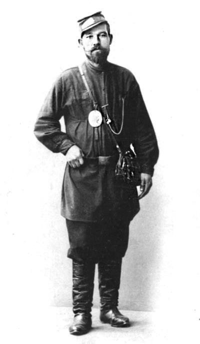 Это – среднего роста мужчина, заплывший жиром, с большим животом. Взглянув на его руки, нельзя не заметить короткие толстые пальцы, растопыренные в стороны. Одет он в потертую жакетку, на голове суконная фуражка, голенища сапог со складками наподобие гармоники.