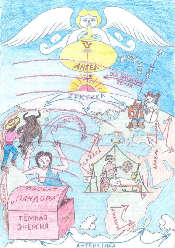 Но и тогда ось вращения Земли сохраняла свой наклон в 66 с половиной градуса по отношению к плоскости орбиты вокруг Солнца, что обеспечивало смену времён года. А теперь эта ось встала торчком, времена года исчезли. Во многих местах жизнь стала очень неуютной. Какая же неведомая сила смогла развернуть Землю? Кстати, для астрономов в новом северном полюсе мира всё-таки есть ориентир — довольно яркая планетарная туманность, а в её центре — маленькая сверхгорячая звёздочка, в десять раз горячее Солнца, но она видна только в телескоп.