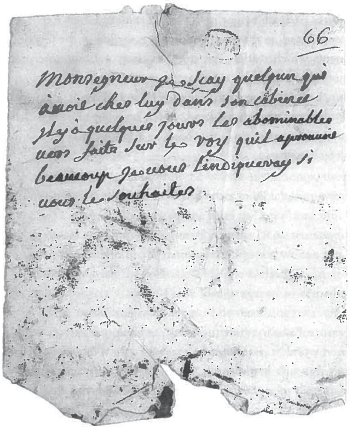 Ответил, что он вовсе не поэт и никогда не писал стихов против кого бы то ни было, но около трех недель назад, когда он был в больнице (Отель-Дьё), навещая аббата Гиссона, начальника больницы, туда примерно в пять часов вечера пришел священник тоже для встречи с Гиссоном; этот священник был выше среднего роста и выглядел лет на тридцать пять; беседа касалась газетных статей; и священник, заметив, что кто-то был столь нечестив, что написал сатирические стихи о короле, показал оду против Его Величества, которую ответчик скопировал там же, в комнате господина Гиссона, но не записав всех строк и пропустив большие отрывки5.