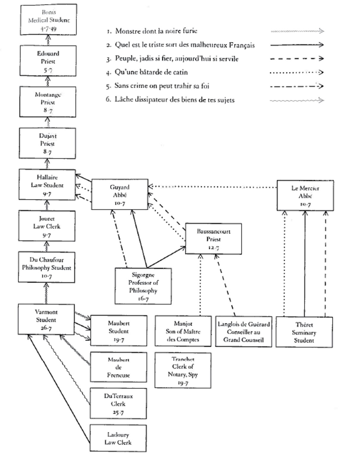 Например, если прослеживать связь с конца, в порядке арестов — от Бони, арестованного 3 июля 1749 года, к Эдуару, арестованному 5 июля, Монтаню, арестованному 8 июля, и Дюжасу, тоже арестованному 8 июля, путь раздваивается после Аллера, арестованного 9 июля. Он получил стихотворение, за которым охотилась полиция, — обозначенное номером 1 и начинающееся словами «Monstre dont la noir furie», — по основной линии, которая идет сверху вниз в левой части диаграммы; он также получил три других стихотворения от аббата Кристофа Гийара, занимающего узловое место в примыкающей к основной линии сети. Гийар, в свою очередь, получил пять стихотворений (два из них идентичные) от троих других людей, которые получили их от своих знакомых. Так, стихотворение 4, начинающееся словами «Qu’une bâtarde de catin» («То, что грязная шлюха...»), пришло от семинариста по имени Тере (обозначен в нижнем правом углу) к аббату Жану Ле Мерсье, потом к Гийару и Аллеру. А стихотворение 3, «Peuple jadis si fier, ajourd’hui si servile» («Народ некогда гордый, теперь раболепствует»), от Ланглуа де Жерара из Верховного суда попало к аббату Луи-Феликсу де Босанкуру, а от него к Гийару. Но стихотворения 3 и 4, согласно информации из допросов, появлялись и в других точках и не всегда продолжали свой путь по цепи (№ 3 вроде бы остановилось на Ле Мерсье, № 2, 4 и 5 — на Аллере). На самом деле стихотворения могли разойтись очень далеко по куда более сложным схемам, чем вмещает одна диаграмма, и большинство из четырнадцати арестованных за распространение поэзии, скорее всего, сильно приуменьшили свою посредническую роль, чтобы не брать на себя бóльшую вину и защитить знакомых.