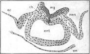 A transverse section through the headfold of this stage is shown in figure 2B. The foregut is seen as a wide cavity, ent, depressed dorsally, apparently, by the formation of the medullary groove and the notochord; it is wider laterally than in a dorso-ventral direction, and its walls are made up of about three layers of closely arranged, irregular cells; the wall is somewhat thinner on the dorsal side, just below the notochord.