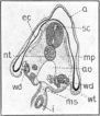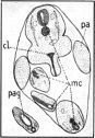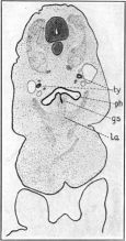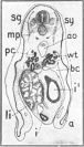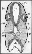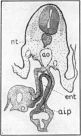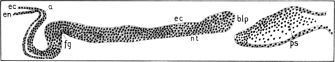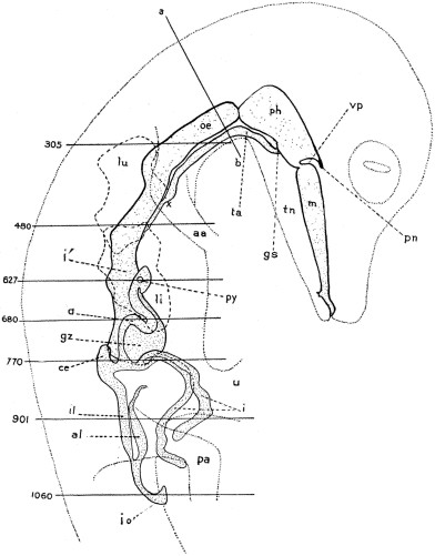 From the stomach the duodenum, d, extends, following a sort of V-shaped course, towards the yolk-stalk, ys. In the region of the yolk-stalk it is somewhat enlarged and ends in a blind sac like a caecum. At the side of this sac is seen the opening of the enteron to the yolk-stalk; the anterior and posterior intestinal portals are not distinguishable from each other. From this point the hindgut, hg, extends cephalad until it lies laterad to the middle region of the duodenum, then bends through 180° and extends, in an almost straight line, to the cloaca, cl, lying in the region of the posterior appendage, pa.
