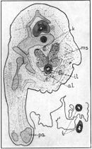 In the region of the posterior appendages, pa, the section passes through the hindgut, hg, and allantois, al. The former is of about the same size as the more anterior sections of the intestine, but its epithelium is less clear and is composed of two or more layers of cells. The allantois is cut near its opening into the hindgut; its walls are thin, the epithelium consisting of but a single layer of more or less flattened cells.