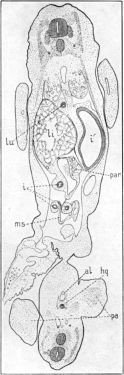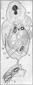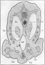 The relative size of the pharynx, ph, as seen in the figure, is smaller than it is in reality because of the small dorso-ventral diameter (the only one here shown) compared to the lateral diameter. The end of the lung rudiment, lu, is slightly enlarged and lies in a plane nearer to the observer than that of the oesophagus, oe, though this is not well shown in the figure.