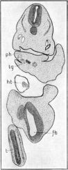 Figure 5C passes through the posterior region of the pharynx, ph, the tip of the forebrain, fb, the anterior edge of the heart, ht, and the curve of the tail, t. The chief point of interest in this section is the thyroid gland, tg. It now lies deep in the tissue of the floor of the pharynx, entirely separated from the pharyngeal epithelium. It consists of a compact mass of cells, now showing a bilobed structure in its anterior end, and extending through about twenty-five ten-micron sections. It is solid throughout most of its extent, but, in the section figured, which is near the anterior end, the lobe on the right side shows a small but distinct cavity scarcely visible in the figure.
