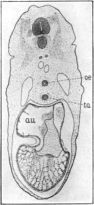 The pharynx becomes gradually constricted to form the oesophagus, oe, a very long and slender structure, which, as will be seen in cross section, is, at this stage, solid for the greater part of its length. As in the case of the pharynx, the lateral diameter of the oesophagus is generally greater than the dorso-ventral diameter.
