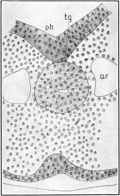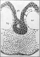 Figure 6C represents the caudal half of the embryo in the plane 475 of figure 6A. The section of the pharynx, ph, is here crescentic in outline, and the pharyngeal walls, especially the floor, are somewhat thicker than in the more anterior section just described. Lying a short distance dorsad to the pharynx are seen two small, thick-walled openings, ty; these are the rudiments of the thymus glands. They are here quite distinct from the enteron, and may be traced through a large number of sections, being in some regions solid and of a smaller diameter than in the present section.