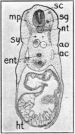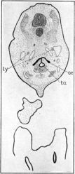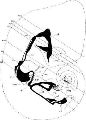 From the floor of the caudal part of the pharynx is pushed out the trachea, ta. In the reconstruction, especially in the anterior end, the trachea appears several times the diameter of the oesophagus; this is due to the great thickness and indefiniteness of its walls rather than to a greater diameter of its lumen.