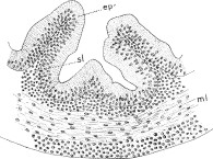 Figure 6B represents a typical section through the pharynx. Its plane is approximately shown by the line 400 of figure 6A though the plane apparently does not cut the eye, e. The pharynx, ph, has here the outline of an irregular V. Its walls, except at the outer angles of the clefts, g1, are composed of but a single layer of cells. In the dorsal wall these cells are flattened, while in the ventral wall they are more rounded. This difference in the shape of the cells accounts for the slightly greater thickness of the floor over that of the roof of the pharynx. The gill clefts no longer communicate with the exterior.