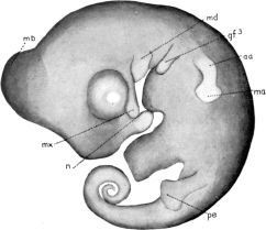 Since the head has now quite a reptilian form, the oral cavity, m, has more or less of the adult outline. A transverse groove near the anterior end of the lower jaw marks off the tongue, tn; and the rudiments of teeth are seen but not shown in the figure because of the low magnification used.