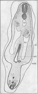 The widely-open mouth, m, leads, with no line of demarkation, into the pharynx, ph, which is of irregular outline and, as has been said, of much greater lateral than dorso-ventral diameter.