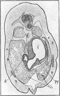At some distance ventrad to the structures just described the intestine is cut, by the plane of the section, in two places, i. The more dorsal of these is inclosed and has, under this magnification, the same appearance as the duodenum, d; a higher magnification, however, shows that its epithelium consists of a single layer of tall, rather clear, columnar cells. The more ventral of the two sections, above mentioned, which is continuous with the dorsal section a very short distance caudad to this point, is in the region that opens to the yolk—in fact a number of yolk-granules, y, may be seen in the opening. The epithelium of this part of the intestine consists of a single layer of clear, columnar cells, which, around the borders of the opening, are thrown into numerous folds and are almost of goblet form.