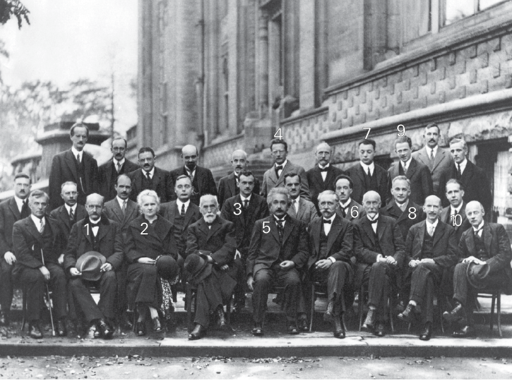 Участники Сольвеевского конгресса 1927 года. Наиболее известные участники обозначены цифрами: 1. Макс Планк, 2. Мария Кюри, 3. Поль Дирак, 4. Эрвин Шрёдингер, 5. Альберт Эйнштейн, 6. Луи де Бройль, 7. Вольфганг Паули, 8. Макс Борн, 9. Вернер Гейзенберг и 10. Нильс Бор (фото из «Википедии»)